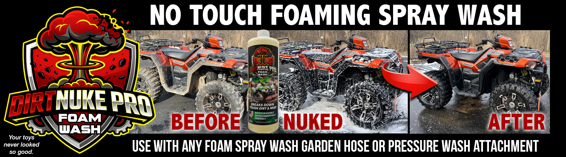 Our NEWEST product, DIRTNUKE PRO is an innovative NO TOUCH de-dirt-ifier! It helps NUKE the dirt from your ATV, dirtbikes, vehicles – anything that might get mud and dirt all over it – like the dirt didn’t even exist!. Simply pre-wet the vehicle, use a foaming spray attachment (garden hose or pressure washer will work) and allow to sit for 1-2 minutes – then spray it off! It literally is that simple and works. It looks like the dirt just melts right off the ATV or dirtbike!